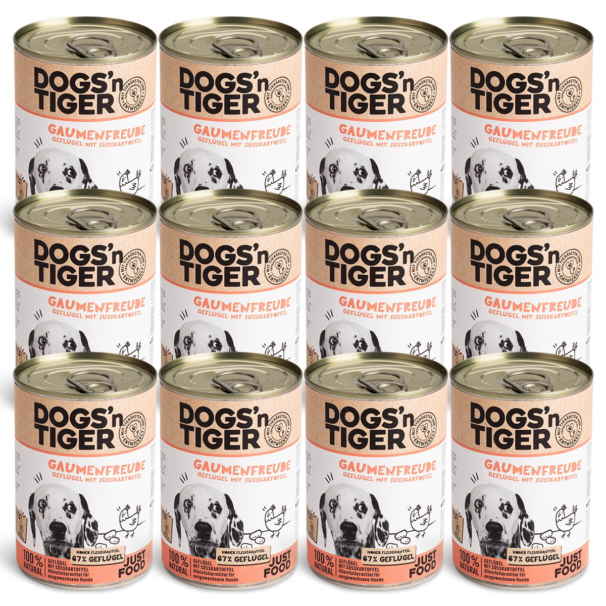 Nährstoffreich. Ausgewogen. Bekömmlich. Das Nassfutter Gaumenfreude – Geflügel & Süßkartoffel von Dogs’n Tiger bietet eine hochwertige, getreidefreie Rezeptur für ausgewachsene Hunde – reich an frischem Geflügel, nährstoffreichem Gemüse und einer fein abgestimmten Kräutermischung.